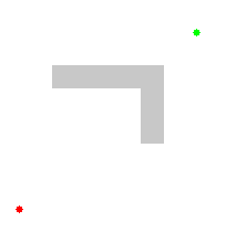 We will be using the A* pathfinding algorithm to help navigate the drone around the map. A* works by favoring open grid cells (“nodes” in our graph) that are deemed the most promising for reaching the goal, according to some heuristic. This heuristic could be a function that determines the distance to the goal, the time to the goal, or even the forces applied to the vehicle. In our case, we will define the heuristic as the Euclidian distance to the goal. An animated example of the A* algorithm (that favors nodes closer to the goal) is shown below. It first explores nodes leading you in the direction of the goal. Once it hits an obstacle, it slowly expands its search until it finds a path around the obstacle and then continues toward the goal.