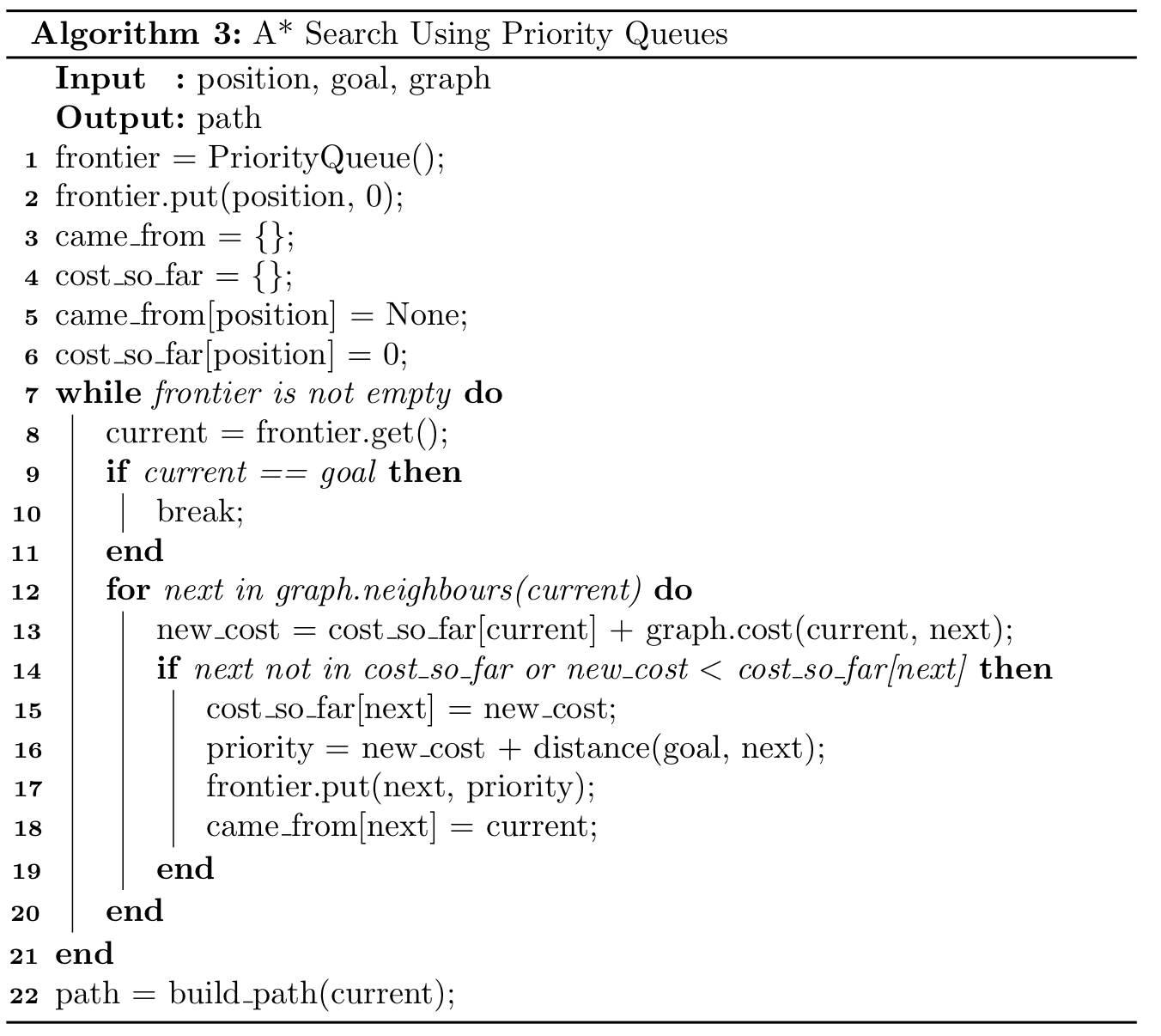 Below is the pseudocode for implementing the A* Algorithm using PriorityQueue’s. Note that the “cost” between nodes is simply the Euclidean distance between them.