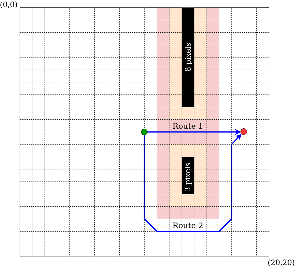 Instead of using a static safe_distance of 1, set the distance to the new parameter you defined. Once you have added the new parameter and updated the AStarPlanner to use this parameter, add the parameter to the fly.launch so that you can change it at launch. Test your code for different distances. The above image shows two different shades around the obstacles, with the orange representing a safe distance of 1, and the red representing a safe distance of 2. When the distance is large enough, the AStarPlanner will not see the route between the obstacles as safe, and instead, go around the obstacles.