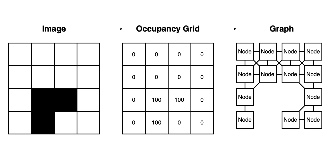 Using this new understanding of grids, we can easily convert our map into a graph. Our map represents free space using 0, and obstacles using 100. Thus, for cells with value 0, we should construct edges to all adjacent nodes that have a value of 0. Moreover, because we are using a drone, we will assume that we can fly diagonally, so we can even connect 0-value cells diagonally. Therefore, our occupancy grid can be converted into a graph as shown below:
