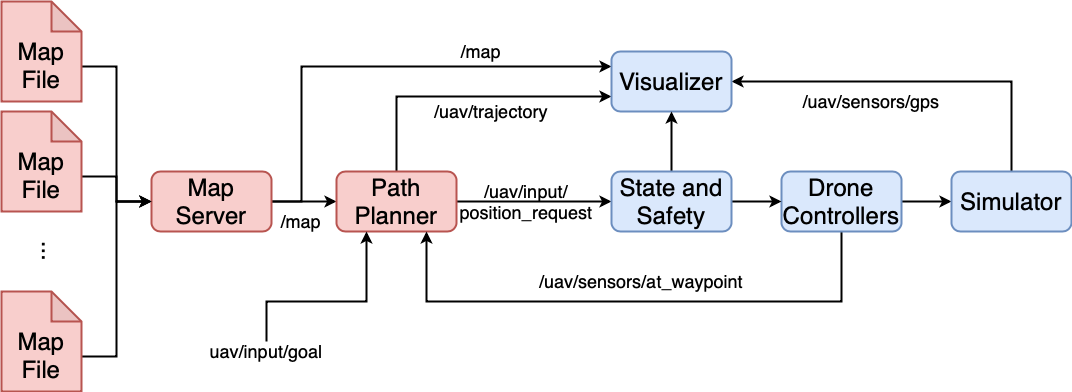 Let’s start to design our system and connect it to the existing system. We know we want to read maps from map files. A map message can then be published on the /map topic for our path planner to read. The path planner will compute a path to reach a goal (given on the topic /uav/input/goal). The path planner will publish the computed path on the topic /uav/path, as well as the next waypoint in the path on the topic /uav/input/position_request. The geofence_and_mission node subscribes to the position_request topic and, if the position is inside the geofence, sends messages to the drone’s controller requesting the next position. This is all shown below in the overview (red means unimplemented and blue means implemented and available for use):