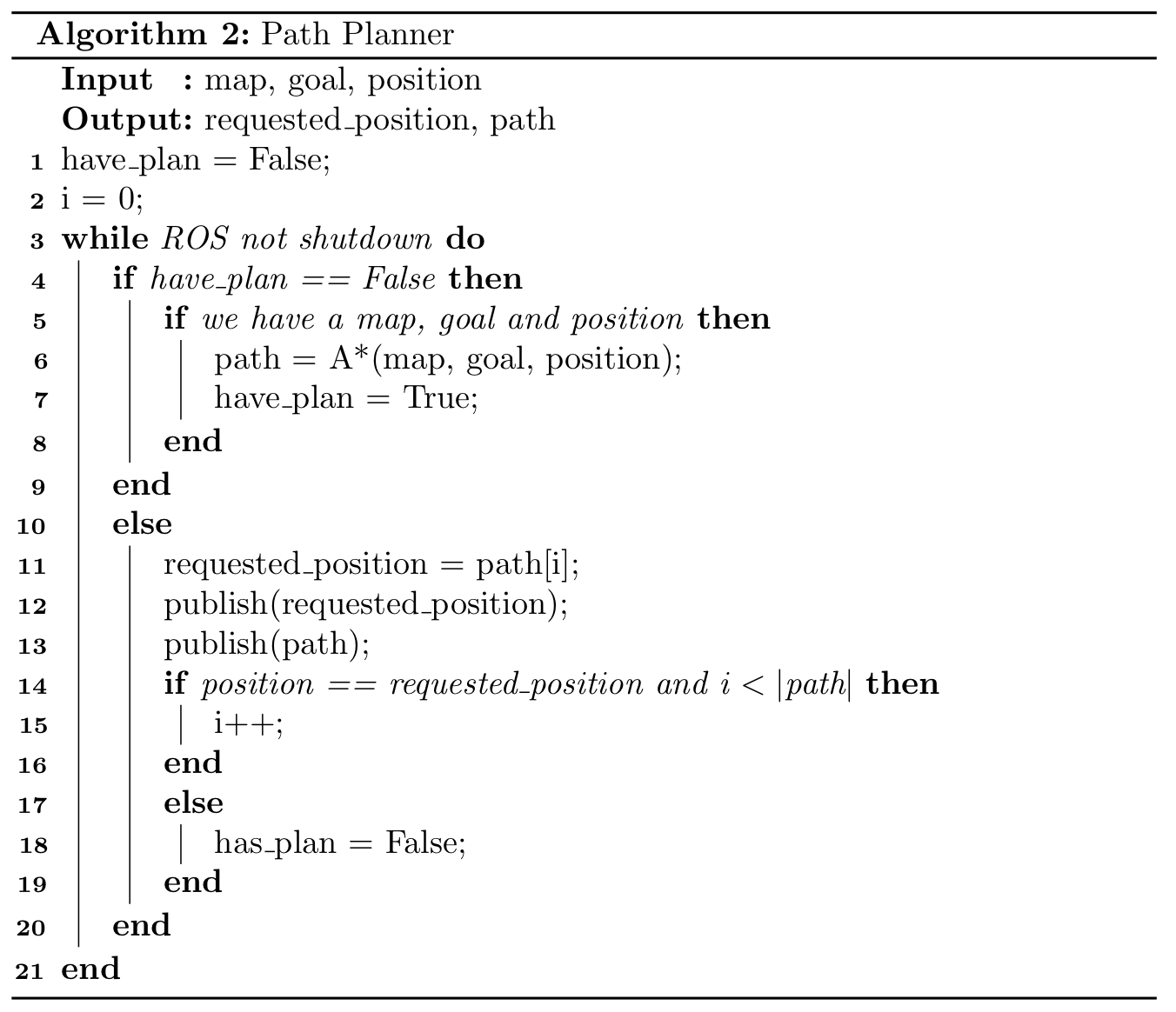 To understand how the path_planner works, let’s follow the pseudocode below. Its takes as input a map, a goal, and the robot position. It initializes variables in lines 1 and 2, and then it iterates until the ROS code is shutdown. In line 4 it checks whether there is a plan generated. If there is no plan and the parameters are valid, it invokes A* to generate a plan in line 6. Once the algorithm has a plan, line 11 gets the next waypoint in the path and publishes both the waypoint and path in lines 12 and 13. Line 14 checks if the drone has reached the requested position and if there are still more points in the path. If these conditions are met, then the next waypoint is retrieved. If the conditions are not met, we reset the has_plan variable.