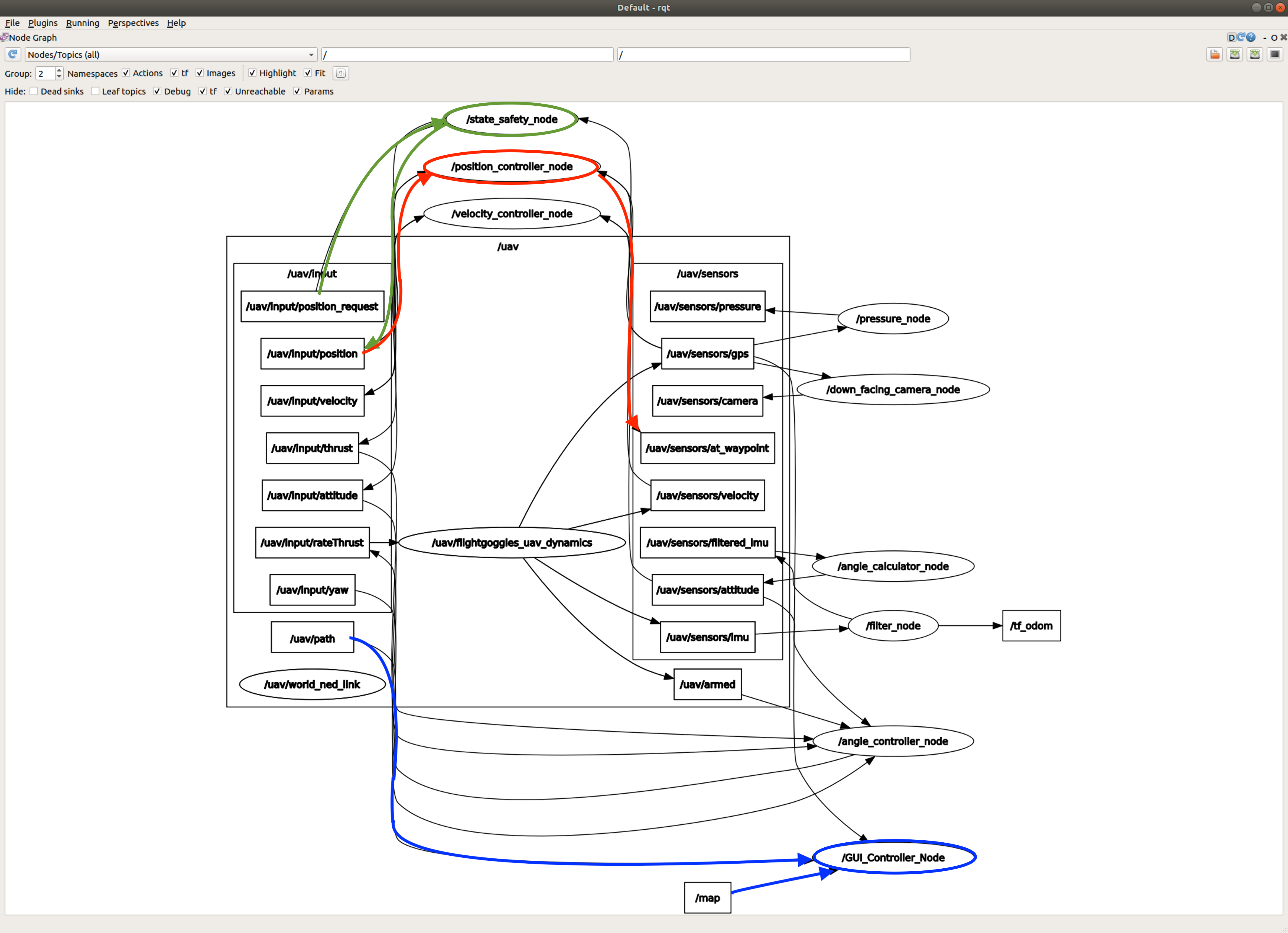 geofence_and_missionnode, and used it to validate the waypoints send to the drone controllers. If you hover your mouse over this node, you will see that it publishes to the/uav/input/positiontopic. We also see that it subscribes touav/input/position_request. Thus, our path planner node will need to send position commands on the topic/uav/input/position_requestto control our drone and allow it to follow a path. -