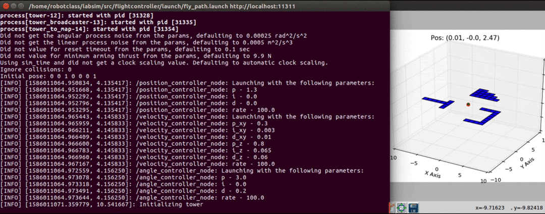 Where px, ix, and dx are the P, I, and D values for the X dimension. When you launch the debugger, a window will appear in the VNC browser that shows the drone trying to navigate from the starting position at the origin, to the first waypoint at x=5, y=0.