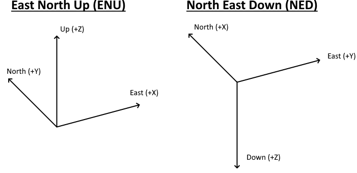 ROS also provides several standardized frames. For example, the ENU (East, North, Up) frame which is commonly used in ground robots has its positive x-axis pointing to the vehicle’s left, positive y pointing north, and the positive z axis pointing up. The frame we will be using in this lab is NED (North, East, Down), which is commonly used in aerial vehicles and has its x pointing north, positive y-axis pointing east, and positive z axis pointing down.