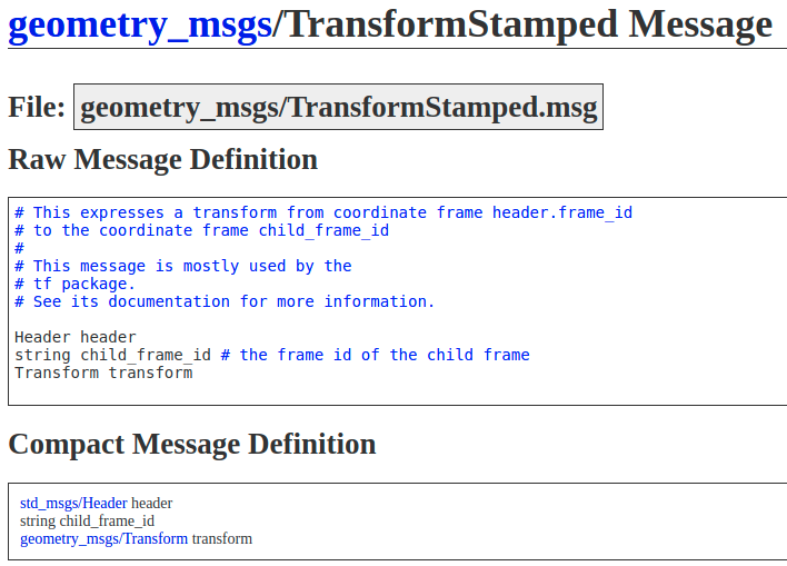 To support transformations of geometric data, ROS provides the message class geometry_msgs/TransformStamped: