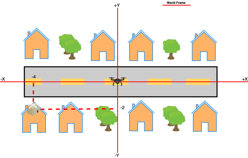 World Frame. In your first tests, you place the drone at the origin of the world frame (as illustrated in the figure above) and try to deliver packages to different houses. You start by delivering a package to the house on the bottom left of the figure (the one with the package). You find that all you need to do is send a Vector3 message to /uav/input/goal containing the coordinates [-4,-2].