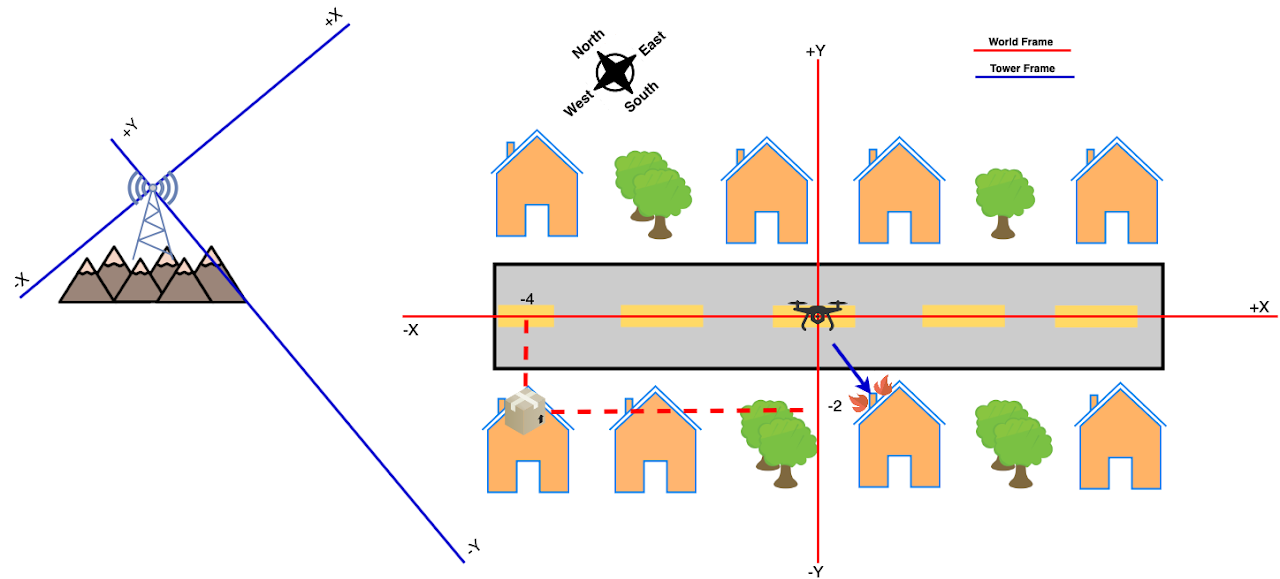 Tower Frame. As you expand your operation, you realize that you need a tower to control your family of drones. You place the tower at the top of a mountain to have longer communication reach. The tower, however, has a frame that is +Y aligned with the magnetic North. The tower then directs the drone to deliver a package to the location corresponding to the same house as before. You send the drone to that location when all of a sudden the drone flights to the right downwards and crashes into the house just below it. What happened? When the tower gave the drone the position to go to, it told the drone where to go in its own frame of reference. When you use poses that are not in the correct frame of reference, it can have unexpected and dangerous consequences.