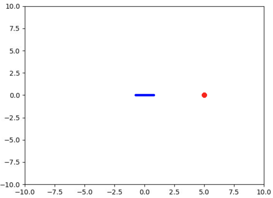 Where the array now contains separate parameters for the X dimension and the Y dimension. The image below shows the result of running python debug_pid.py "[[0,0,0],[0,0,0]]". As noted, there is a strong cross-wind in the Y dimension that constantly blows the drone off course. Here, without any control in the Y dimension, the drone is quickly blown off screen.