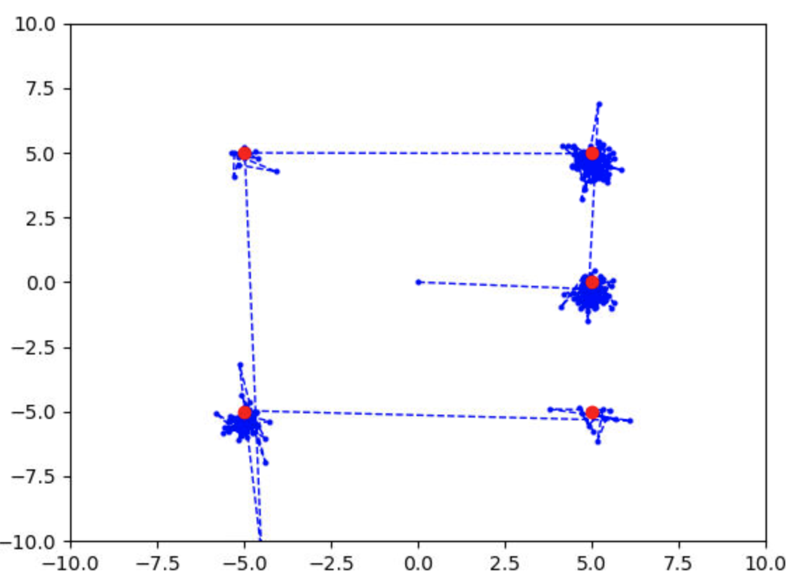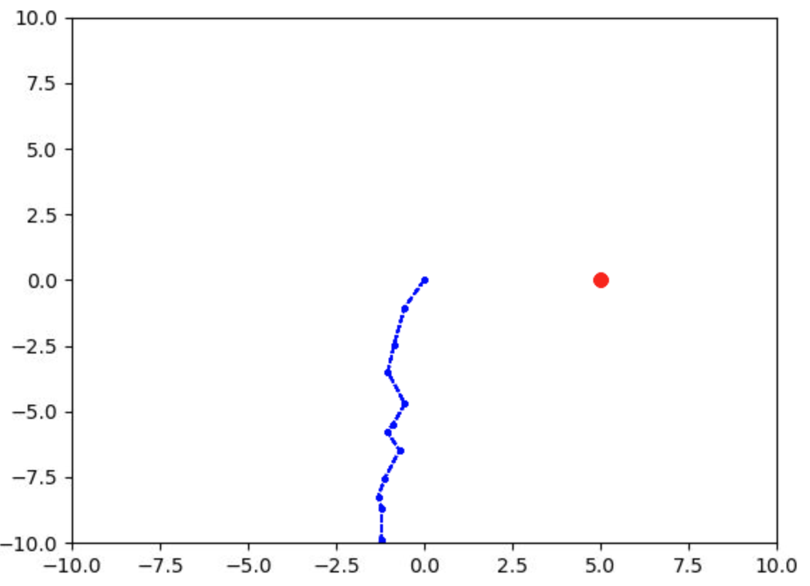 There is noise in the system, so the drone will not always respond exactly to the command, and will move around slightly even when not commanded. For example, the below image shows the output of python debug_pid.py [0,0,0]. With all 0 parameters, the PID controller provides no input and the drone is blown around by the noise without reaching the waypoint.