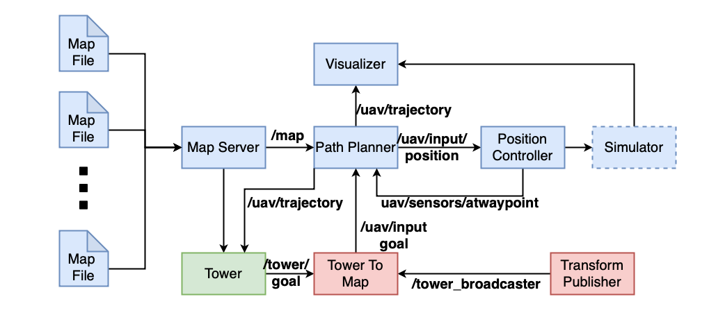 In this lab, a tower node is provided. The tower will publish goal positions (once a drone’s path is complete) on the /tower/goal topic, using the tower frame. Your job will be to use ROS transforms to convert the tower’s commands into the world frame so that the drone can successfully navigate to the goals positions sent to the drone.