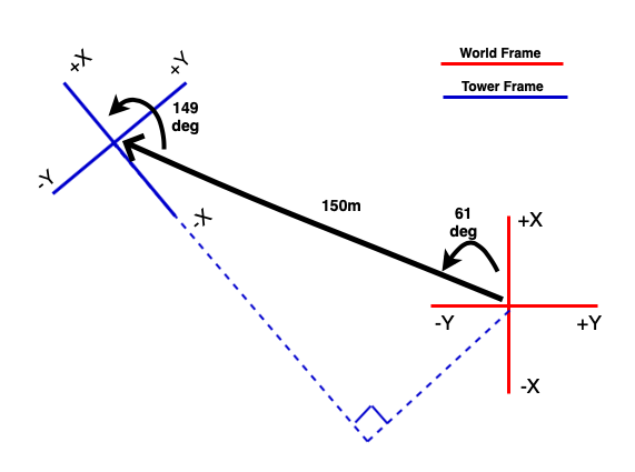 In this lab, we are aiming to transform the tower reported positions into the corresponding positions in the world frame that our drone understands. The diagram below gives specifics about the location of the tower relative to the origin of our world.