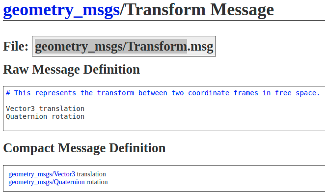 The transform attribute is defined as a message of type geometry_msgs/Transform, which consists of the mathematical transformation between two 3D Cartesian frames translation followed by a rotation.